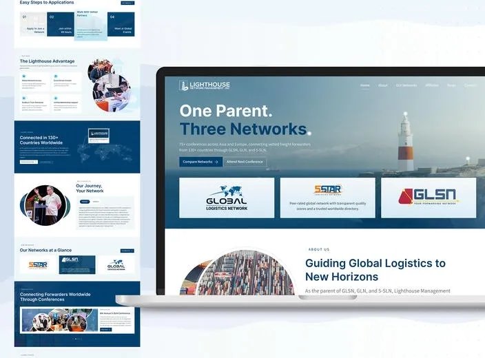 A clean website positioning Lighthouse as the central hub connecting three logistics networks, focused on clarity and trust.